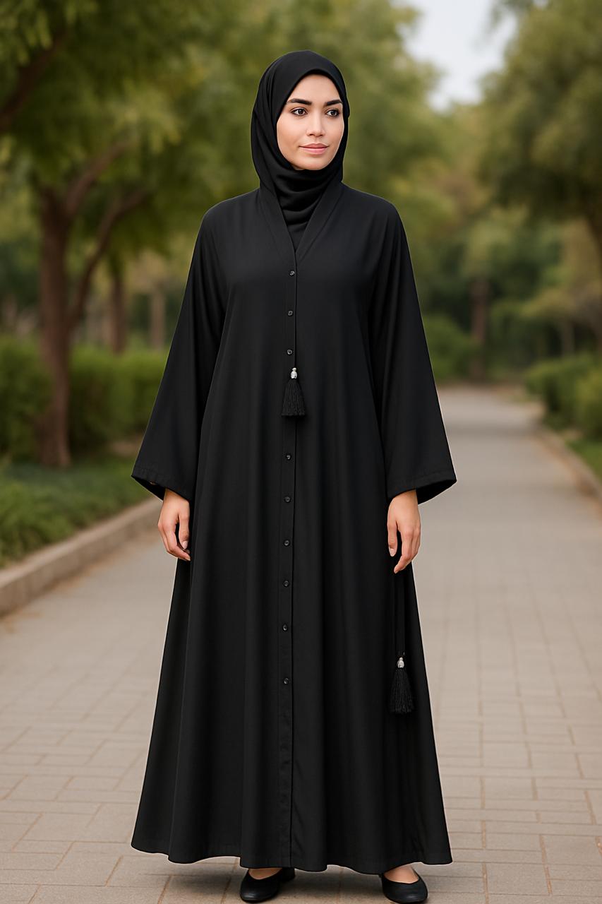 Premium Nida Black Simple Open Abaya with buttons Full Flair