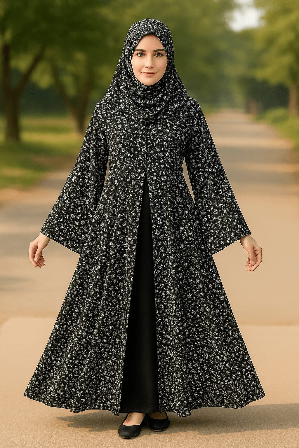 Tiny white-floral print Abaya with matching Stoller