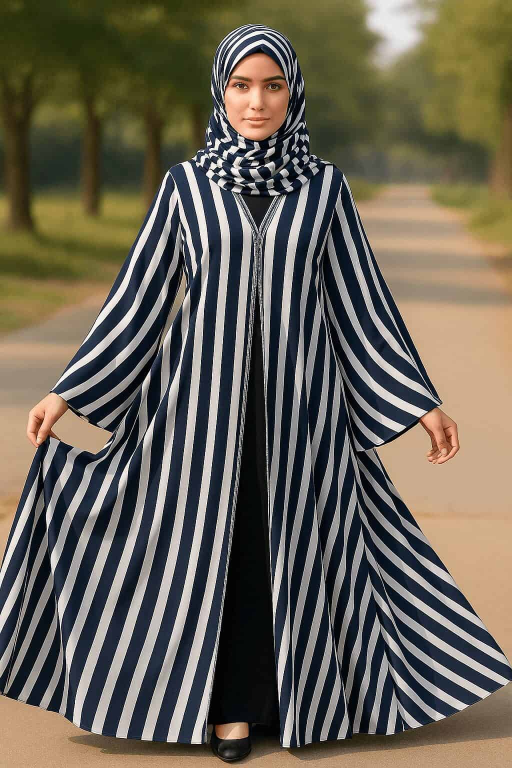 White & Navy Blue lining Abaya